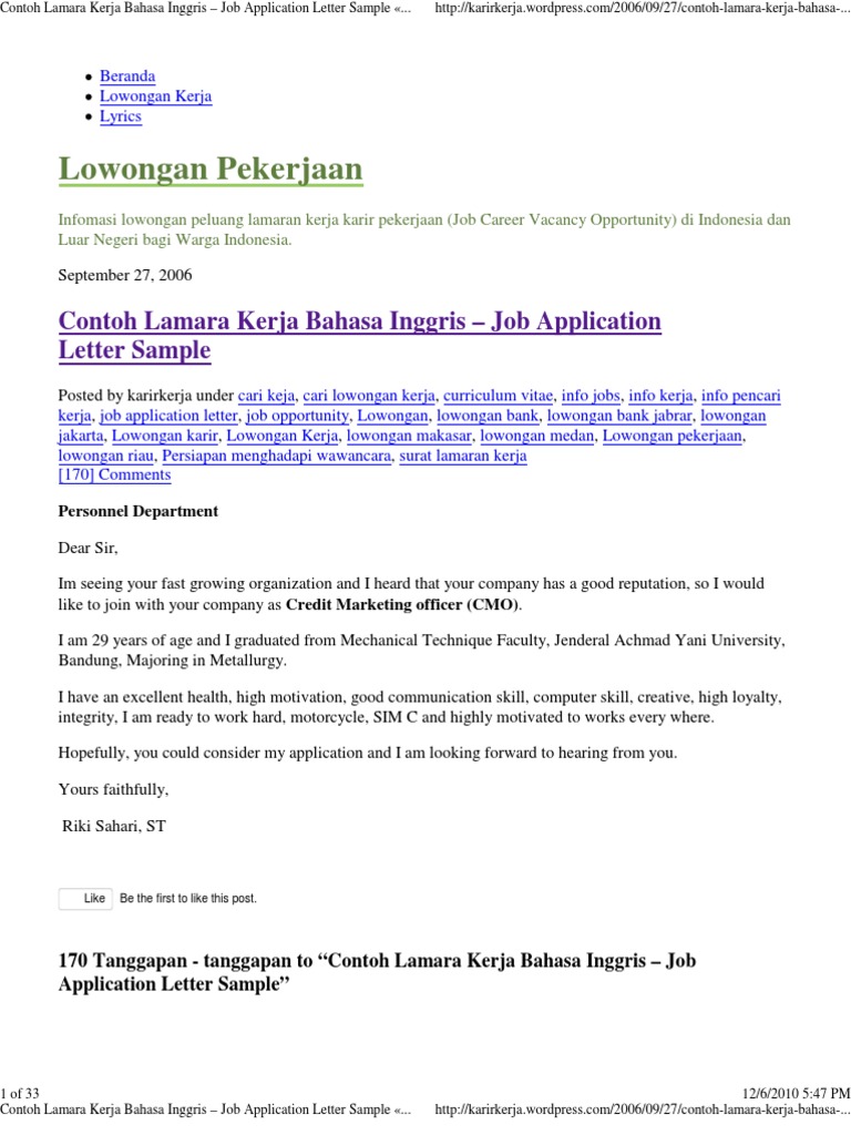 .inggris job application letter sample posted by karirkerja under cari keja, cari lowongan kerja, curriculum vitae, info jobs, info kerja, info pencari kerja, job dalam bahasa inggris. To make the employer interested and call the writer for an interview. Contoh cover letter bahasa indonesia. Setelah lulus sekolah ataupun kuliah, kemudian hal yang kita lakukan adalah mencari pekerjaan. Simak contoh cover letter dalam bahasa indonesia dan bahasa inggris, serta tips membuat cover letter yang berkualitas berikut ini!